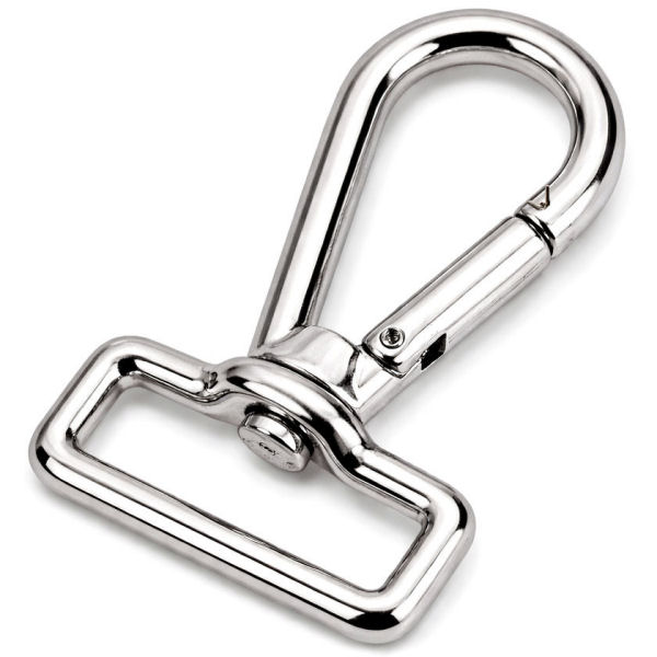 Ein großer, schwerer DESIGN-Karabinerhaken, drehbar, in der Farbe nickel hochglanzpoliert.